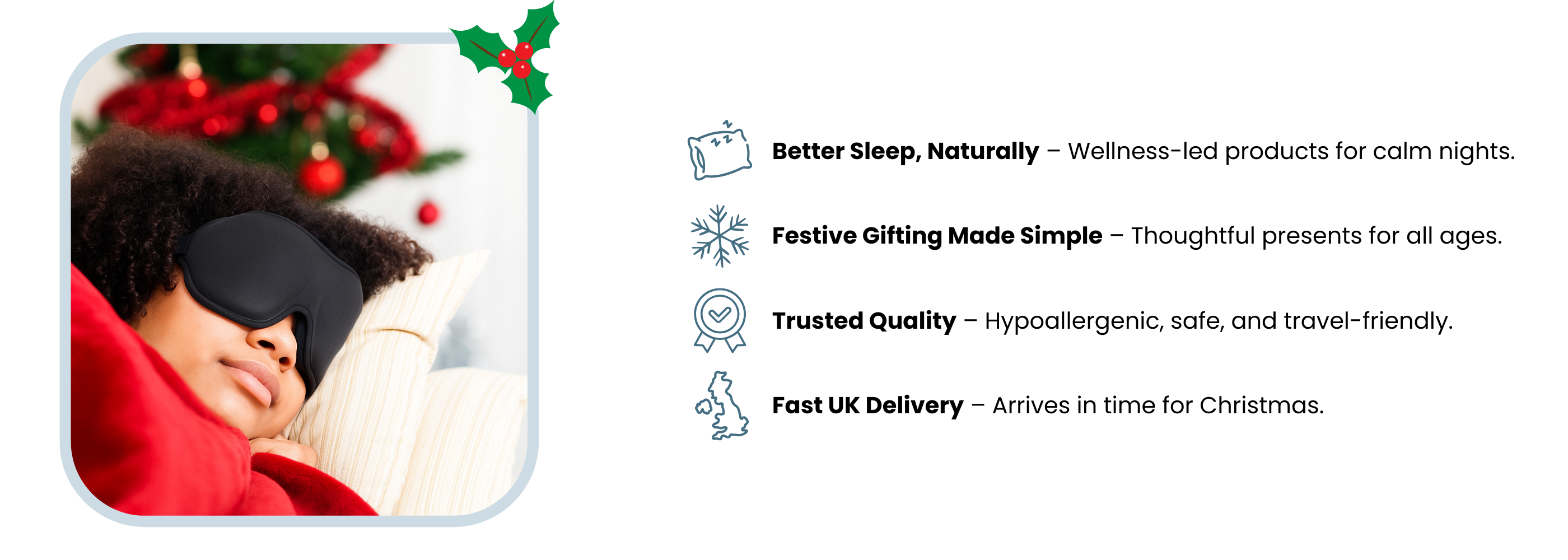 A blackout eye mask combined with built-in Bluetooth audio. Listen to soothing sounds or white noise while enjoying total darkness for the ultimate restful sleep.
