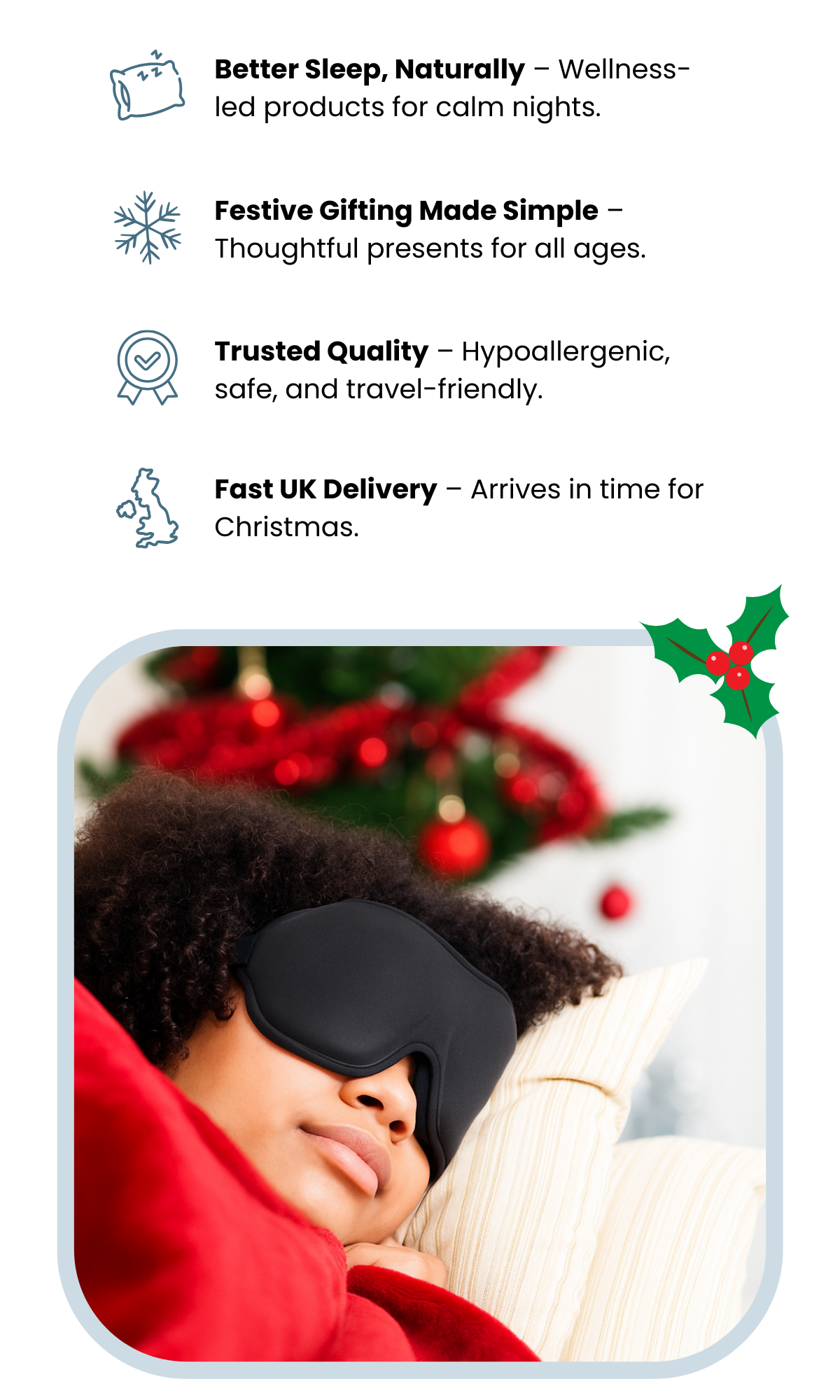 A blackout eye mask combined with built-in Bluetooth audio. Listen to soothing sounds or white noise while enjoying total darkness for the ultimate restful sleep.